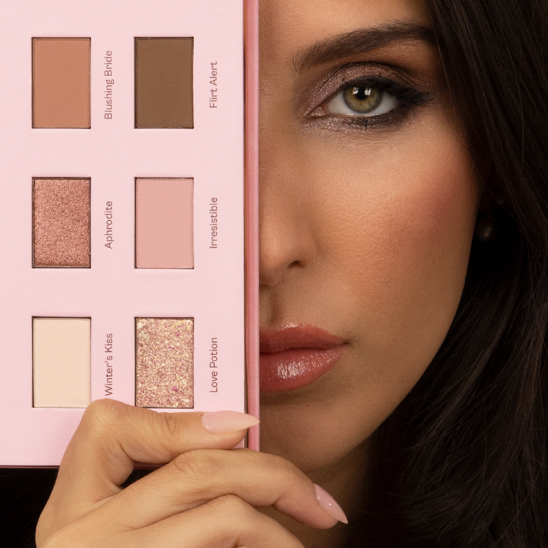 See the world through rose-coloured eyelids with the lovely tones of TOUJOURS Pink Palette: Winter’s Kiss, Aphrodite, Blushing Bride, Love Potion, Irresistible, and Flirt Alert.